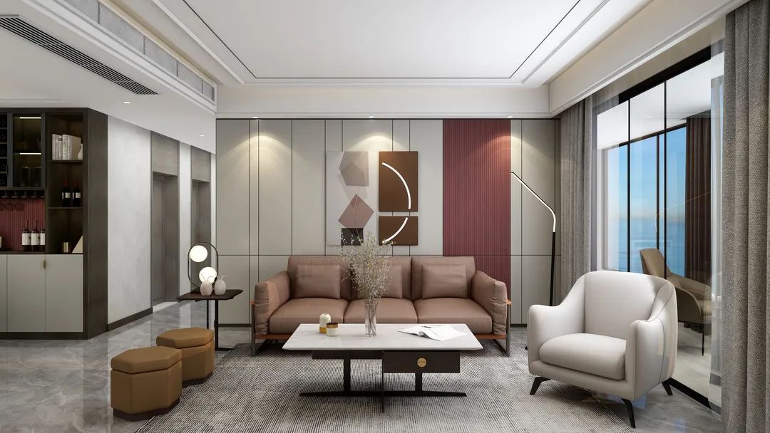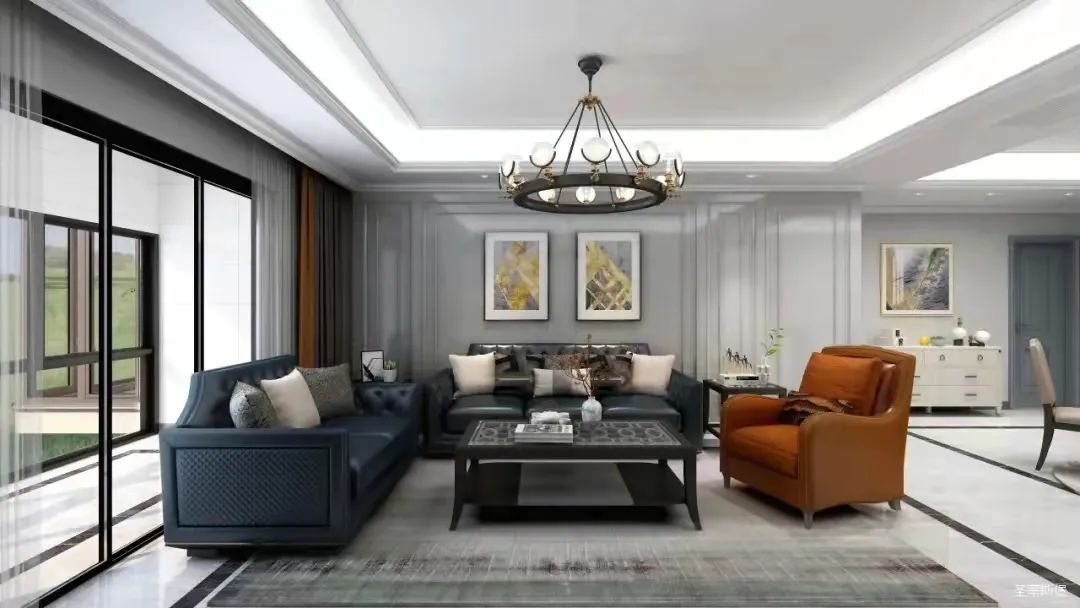 沙发皮色采用深浅不一的咖色拼接。让空间显得精致有质感。在沙发的扶手边框、底座,融入了爱马仕橙,让空间多了些灵动的生活气息。搭配简约单椅,给人一种视觉上的高级感。